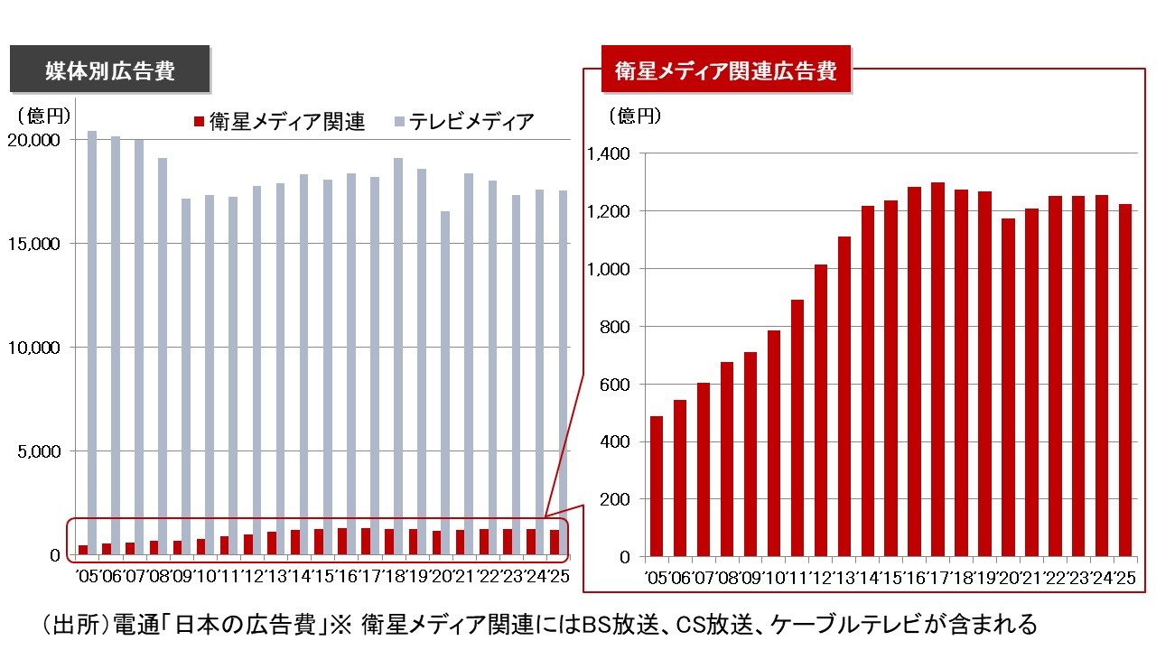 株式会社電通が発表した「2025年 日本の広告費」によれば、2025年のテレビメディア広告費は総額で1兆7,556億円(前年比99.7%)、衛星メディア関連広告費は1,223億円(前年比97.5%)と推移しております。
